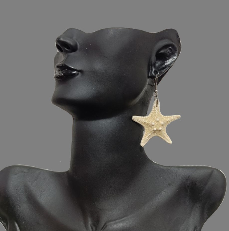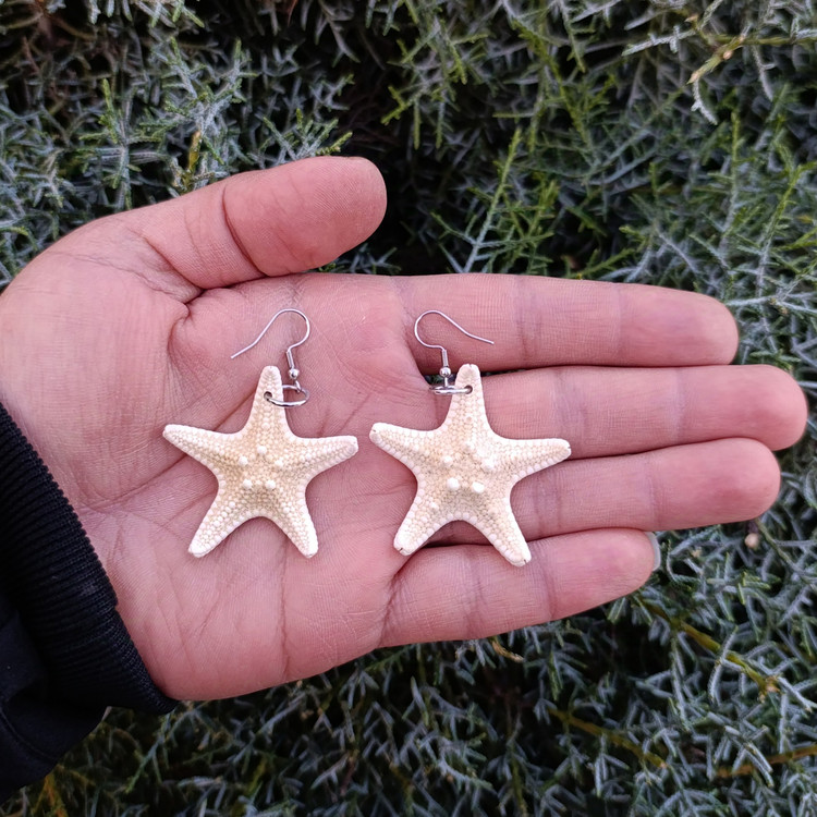 جنس گوشواره از ستاره دریایی طبیعی بوده و جلوه ی بسیار زیبایی دارد.حلقه و عصایی بکار رفته در کار نیز استیل بوده و رنگ آن ثابت است. بدون بو و وزن آن سبک است.سایز ستاره ها به طور تقریبی 4 الی 5 سانتی متر است