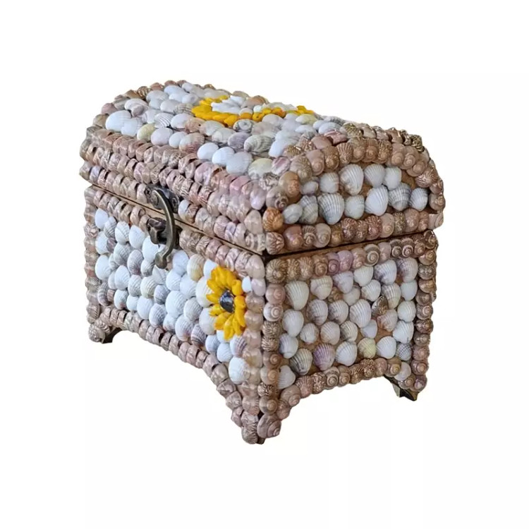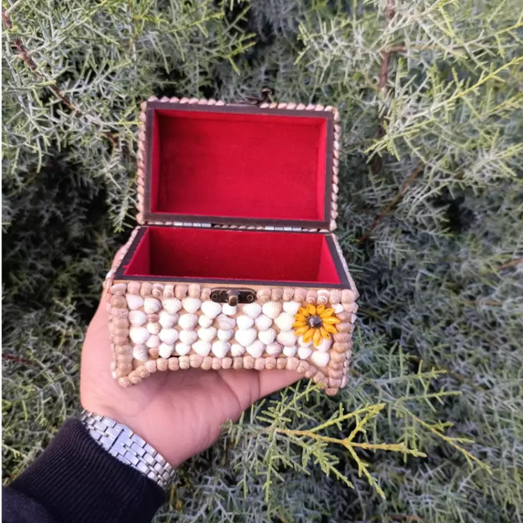 این جعبه هدیه دست ساز از چوب ساخته شده و روی آن با صدفهای طبیعی تزیین شده است.دیواره های داخلی با مخمل پوشانده شده تا به زیبایی محصول اضافه شود.از این جعبه ی زیبا میشود بعنوان جعبه کادو و جای زیورآلات و نیز بعنوان منظم کردن لوازم ریز استفاده کرد.